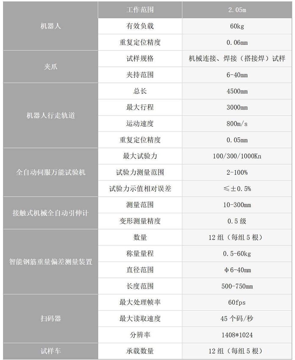 產(chǎn)品整體程序模塊化設(shè)計,插裝式構(gòu)建,主要由智能工業(yè)機器人、全自動伺服萬能試驗機、全自動引伸計、智能鋼筋重量偏差測量裝置、掃碼器、試樣車、試樣車定位架、顯示屏、電腦等組成。